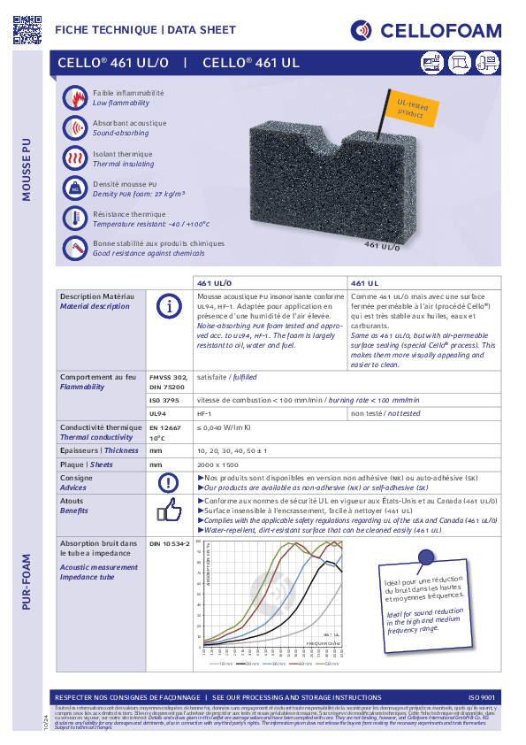 Mousse PU dotée d'une surface fermée, perméable à l'air. La classification UL, la surface hydrofuge et oléofuge, l'extrême résistance aux contraintes mécaniques de la Mousse Cello® 461 UL sont des propriétés plus que convaincantes.Détails produits