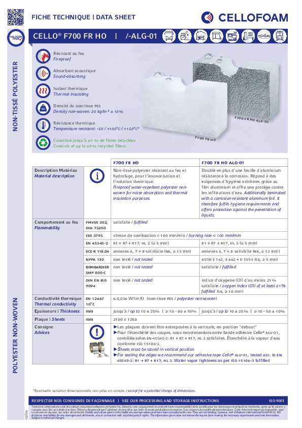 Non-tissé polyester blanc, hydrofuge, doublé d'une surface en aluminium. Le non-tissé Cello® F700 FR HO ALG-01 montre une résistance au feu (aux tests les plus divers) exceptionnelle.Détails produits