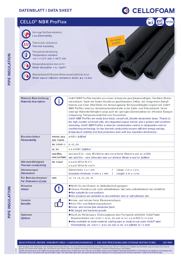 Cello® NBR ProFlex est fabriqué à partir d'une mousse élastomère flexible noire à cellules fermées. Grâce à ces cellules fermées, au pare-vapeur intégré et à une surface de haute émissivité, Cello® NBR ProFlex est idéal pour le contrôle de la condensation dans les techniques de réfrigération et de climatisation. Sa faible conductivité thermique garantit des économies d'énergie efficaces, la stabilité de la température et la protection contre le gel, même en cas de faible épaisseur.Détails produits
