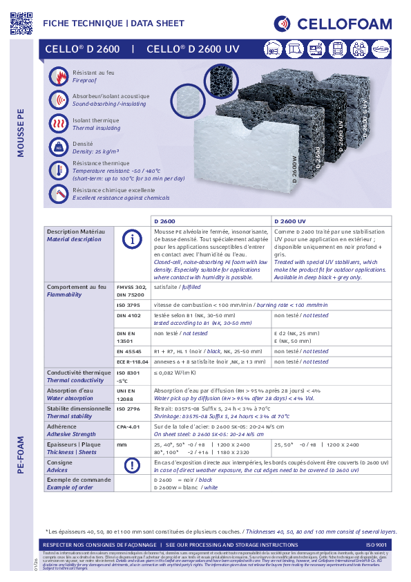 Mousse PE alvéolaire fermée. Insonorise et amortit les bruits. La mousse Cello® D 2600 se caractérise par sa grande résistance, sa bonne stabilité à l'eau, au gel et à l'encrassement.Détails produits