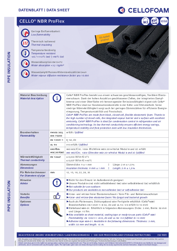 Cello® NBR ProFlex est fabriqué à partir d'une mousse élastomère flexible noire à cellules fermées. Grâce à ces cellules fermées, au pare-vapeur intégré et à une surface de haute émissivité, Cello® NBR ProFlex est idéal pour le contrôle de la condensation dans les techniques de réfrigération et de climatisation. Sa faible conductivité thermique garantit des économies d'énergie efficaces, la stabilité de la température et la protection contre le gel, même en cas de faible épaisseur.Détails produits